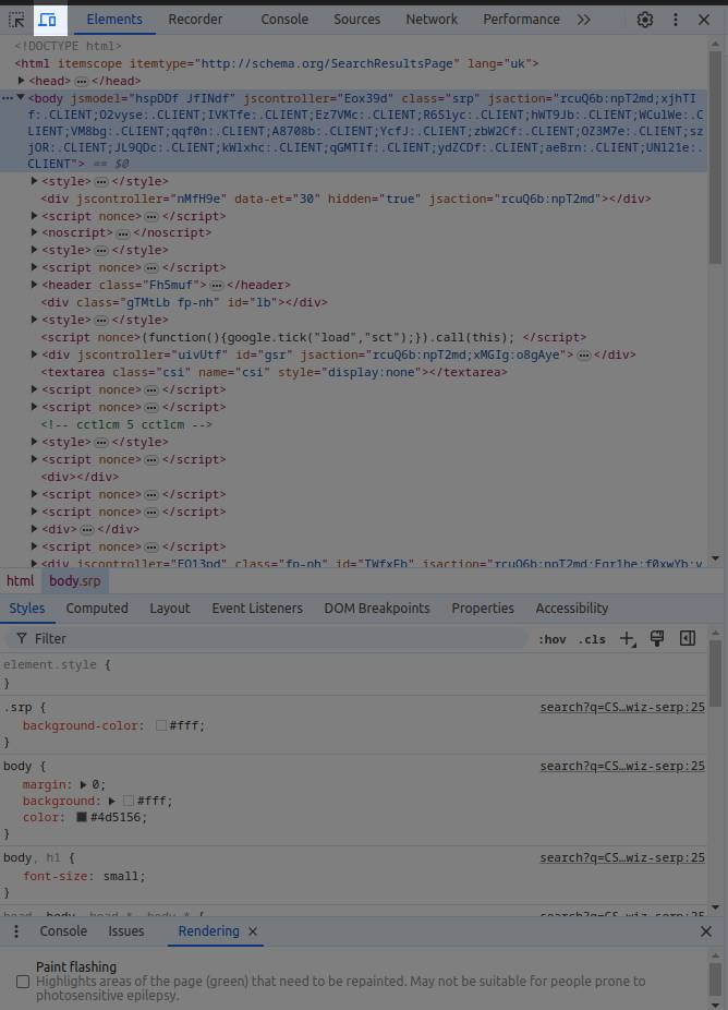 Для перевірки можна використовувати звичайний браузер комп’ютера. Будь який сучасний браузер дозволяє подивитись на сайт в довільних розмірах вікна. Для браузерів на базі Chromium (Chromium, Google Chrome) достатньо відкрити інструменти розробника (права клавіша миші -> Інспектувати, або Ctrl + Shift + C, або F12) та напискаємо зображення ноутбуку та мобільного телефону (див. скріншот) або просто написнути комбінацію Ctrl + Shift + M.